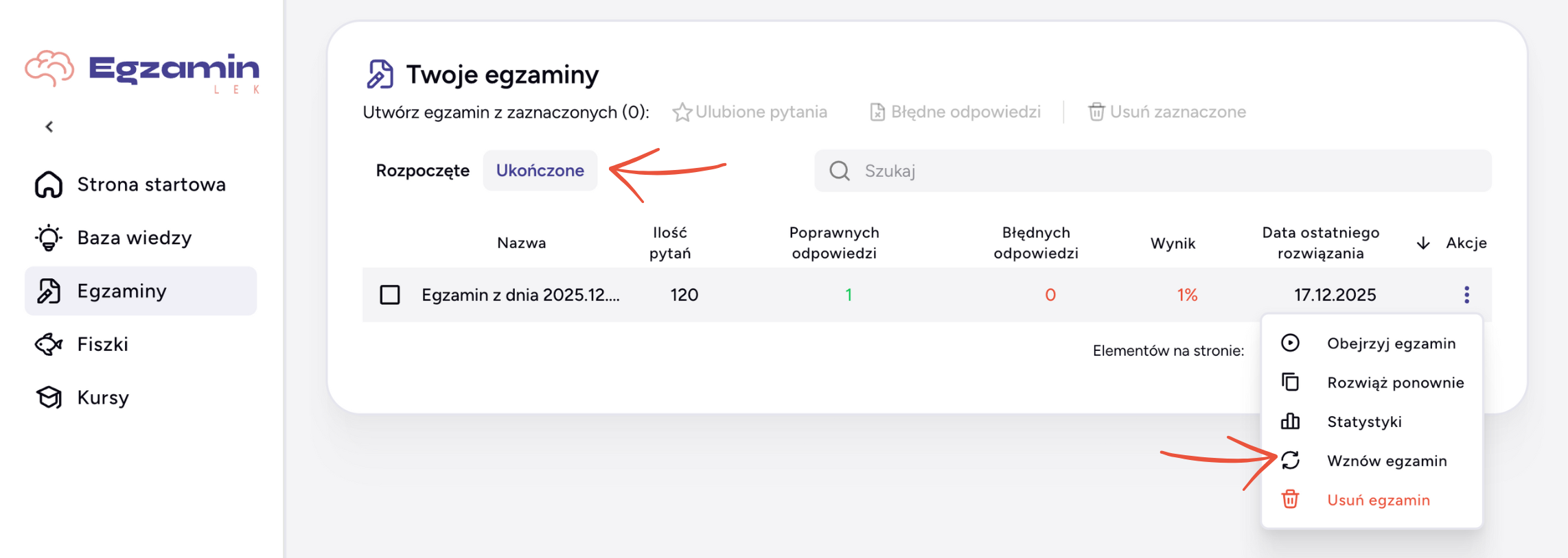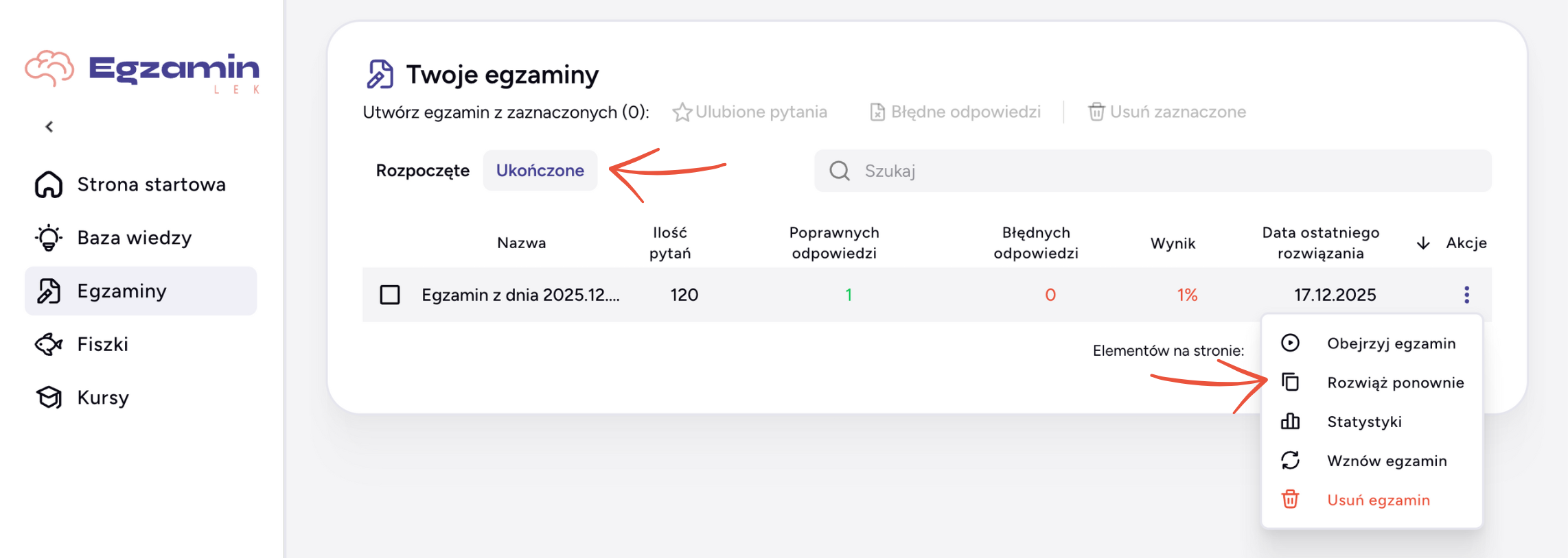 5. Rozwiązania ponownie tego samego egzaminu - pozwala na ponowne rozwiązanie wybranego egzaminu od początku.