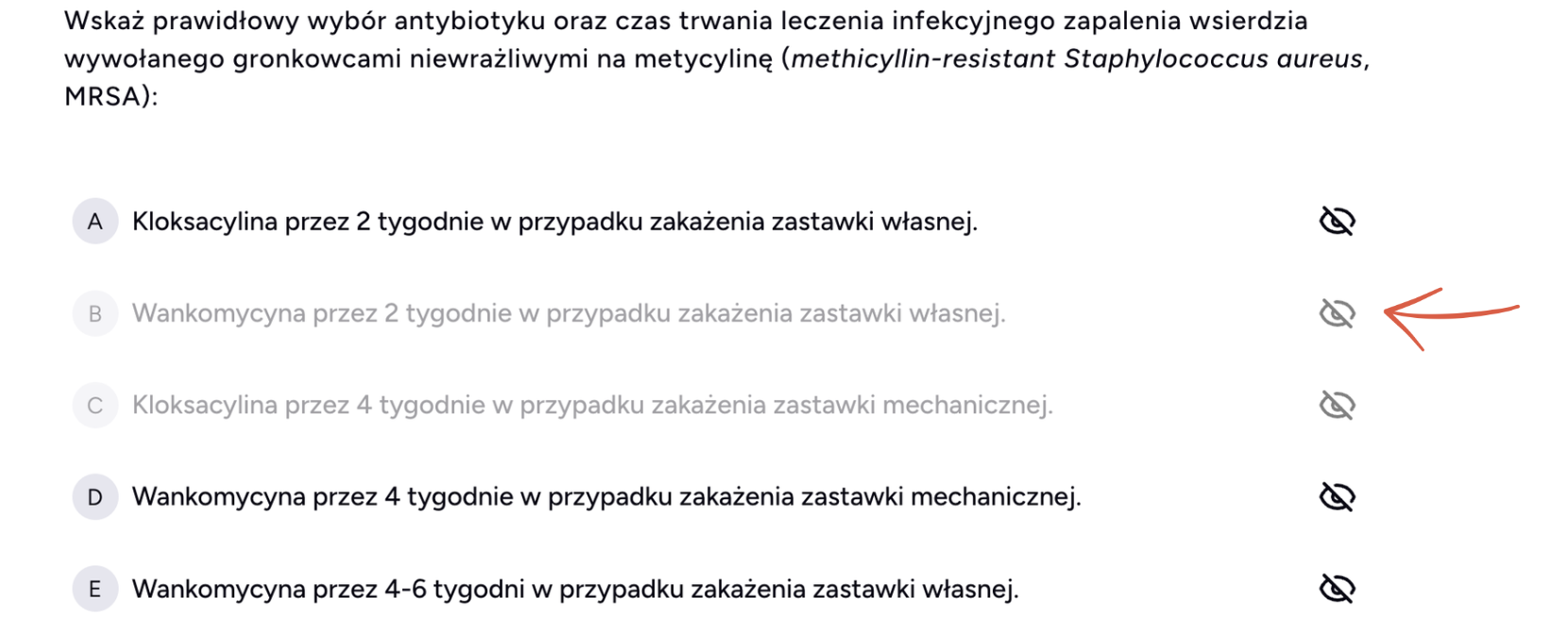 3. Wykluczanie odpowiedzi - ta opcja umożliwia eliminowanie dystraktorów, podczas udzielania odpowiedzi na pytanie.