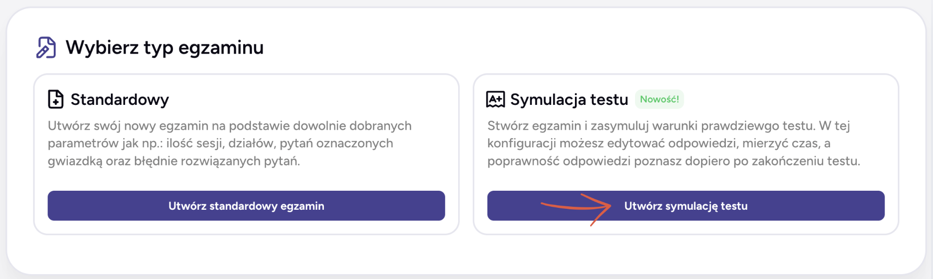 Aby utworzyć taki egzamin należy w zakładce Egzaminy wybrać opcję Utwórz symulację testu oraz odznaczyć opcję Timer, następnie można skorzystać z pozostałych dostępnych filtrów i utworzyć egzamin.