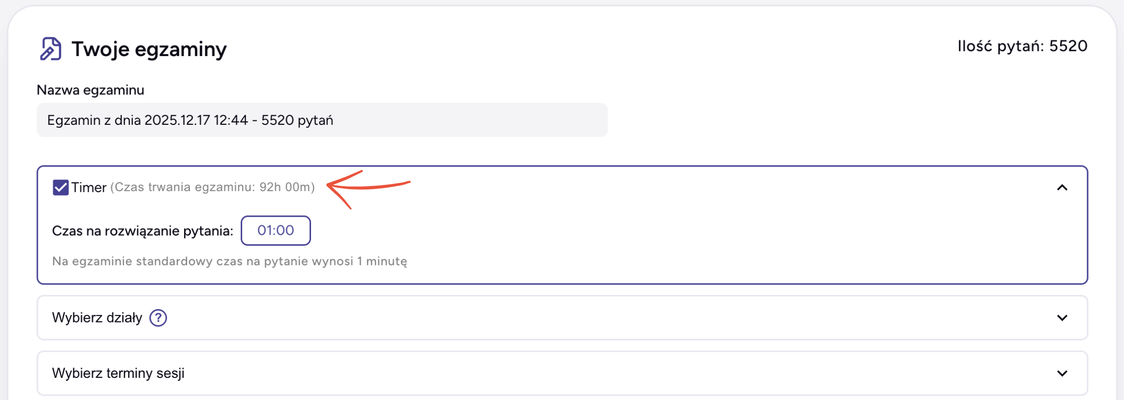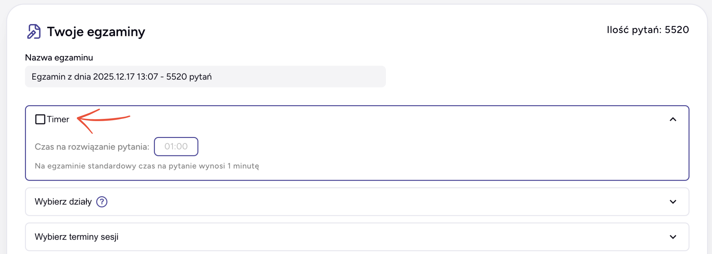Aby utworzyć egzamin z timerem należy w zakładce Egzaminy wybrać opcję Utwórz symulację testu. Domyślnie czas przeznaczony na jedno pytanie wynosi 1 minutę, ale czas ten można zmieniać według własnych preferencji. Następnie można skorzystać z pozostałych dostępnych filtrów i utworzyć egzamin.