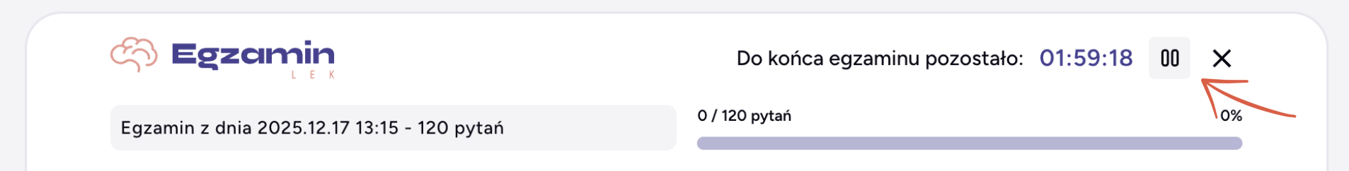 Timer może zostać zatrzymany oraz wznowiony w trakcie rozwiązywania egzaminu, jeśli potrzebna jest przerwa.